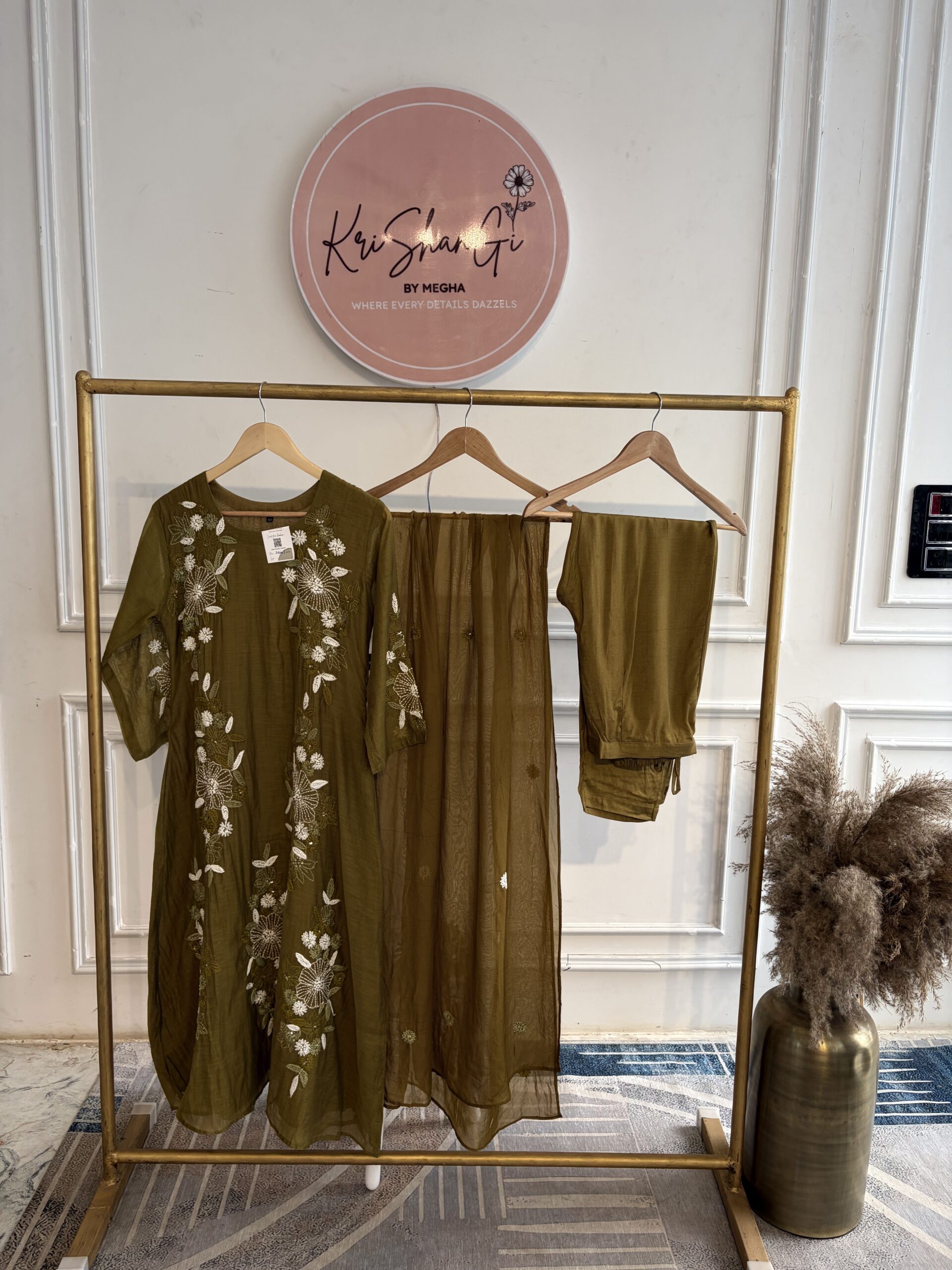 Elevate your ethnic style with this Mehendi Green Mul Chanderi Suit Set, crafted with graceful detailing and lightweight fabric.