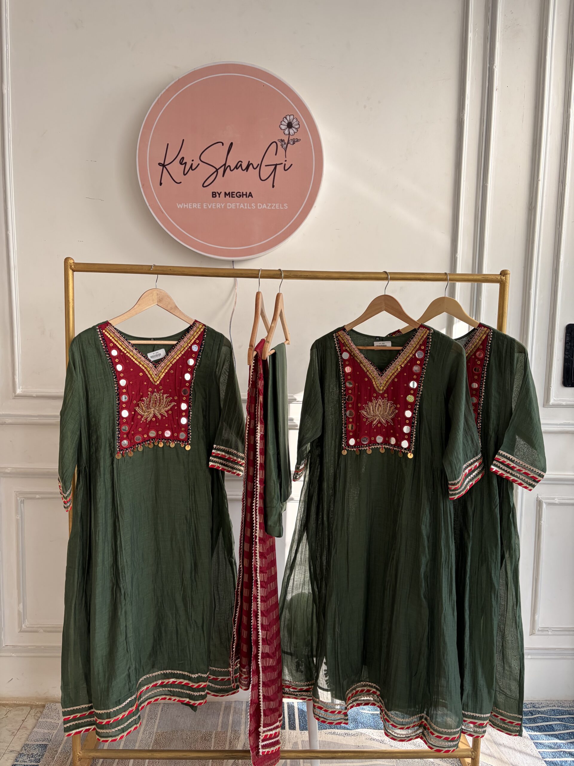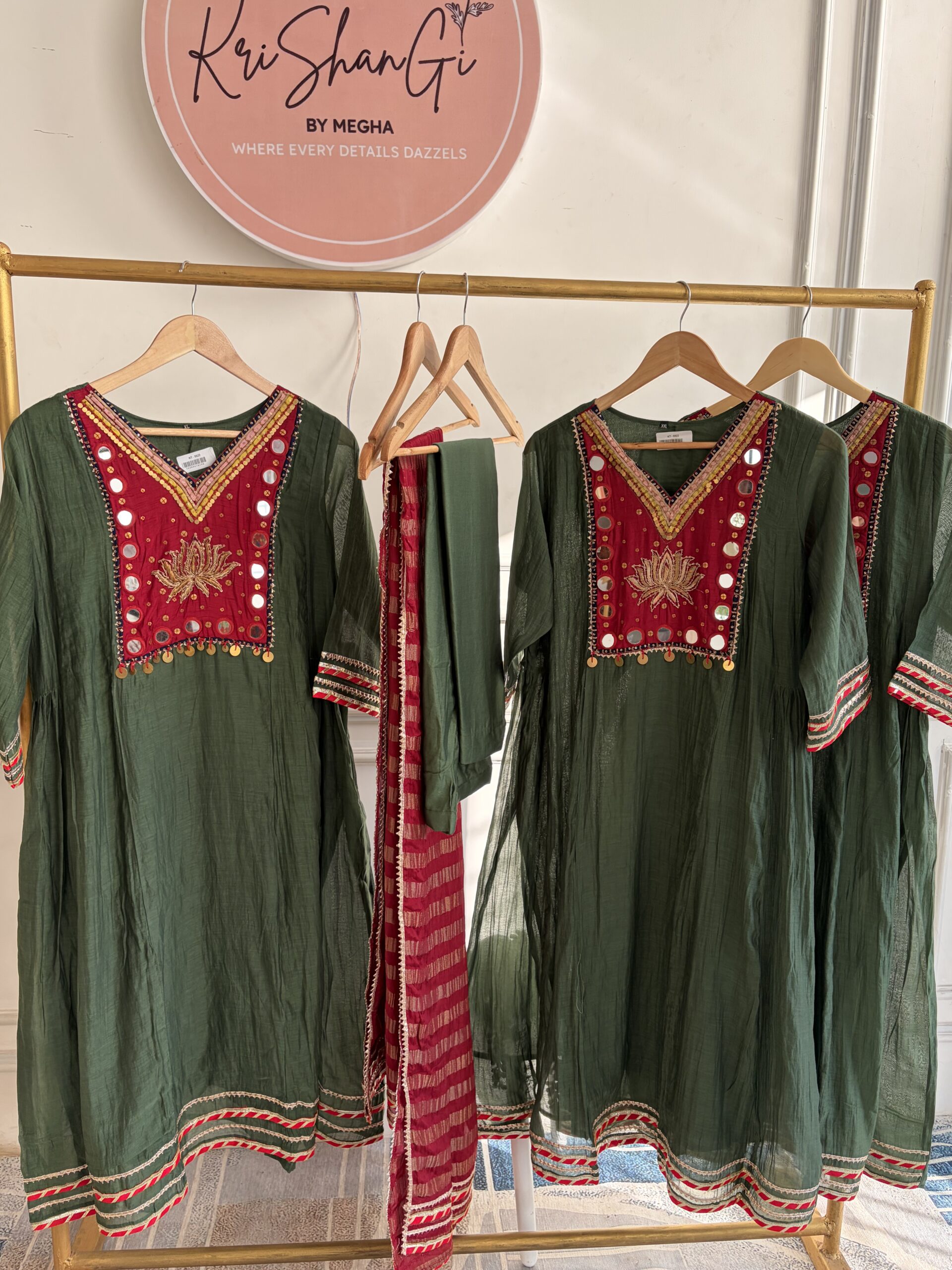 Elevate your festive wardrobe with this beautifully handcrafted Mul Chanderi Suit Set, designed with rich traditional embellishments and graceful finishing.