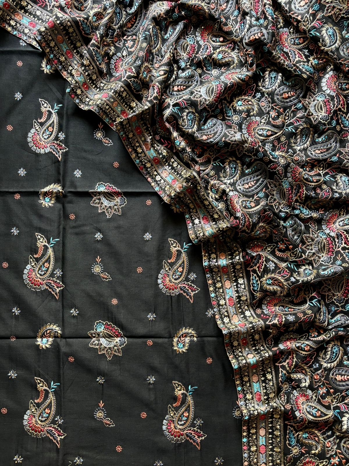✨ Dupatta: Pure Silk Chanderi dupatta featuring beautiful heavy multicoloured embroidery (2.5 metres)
