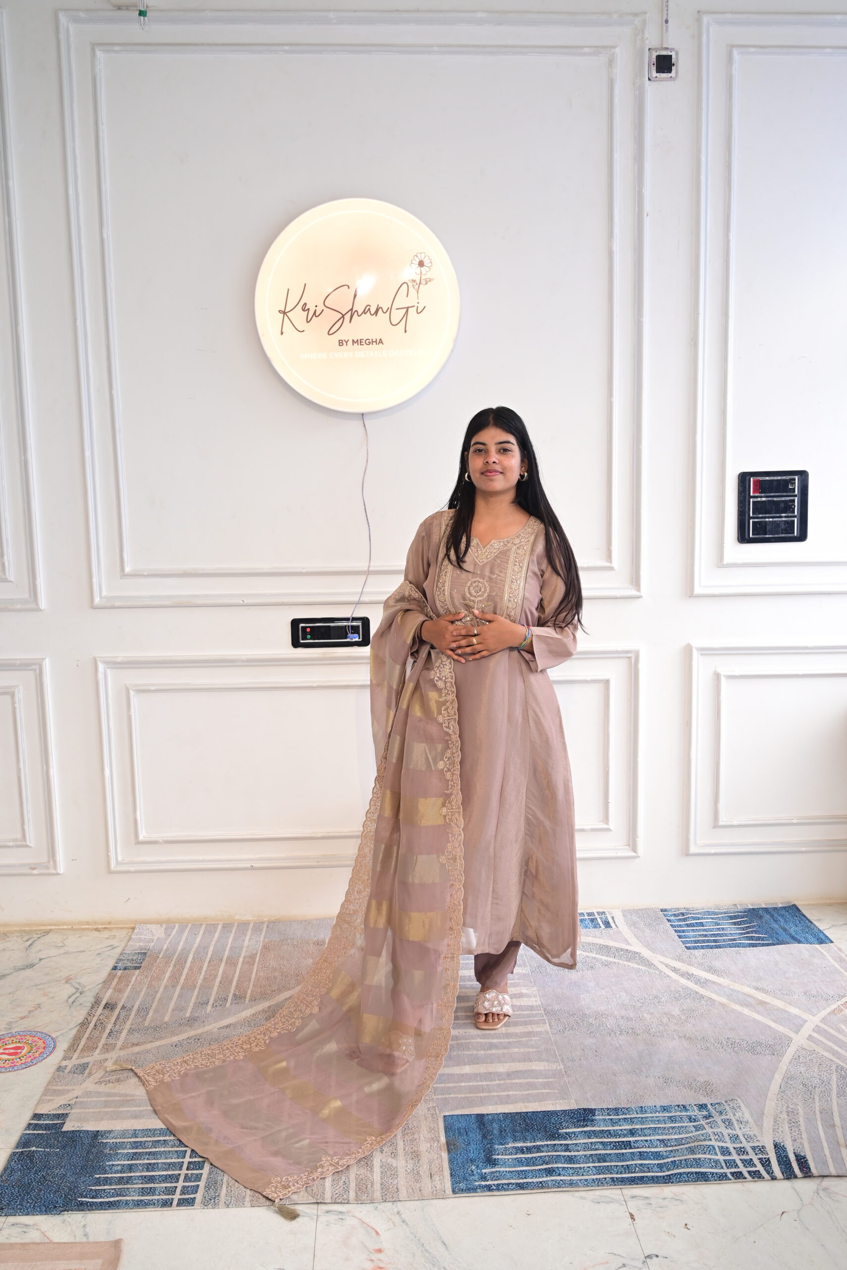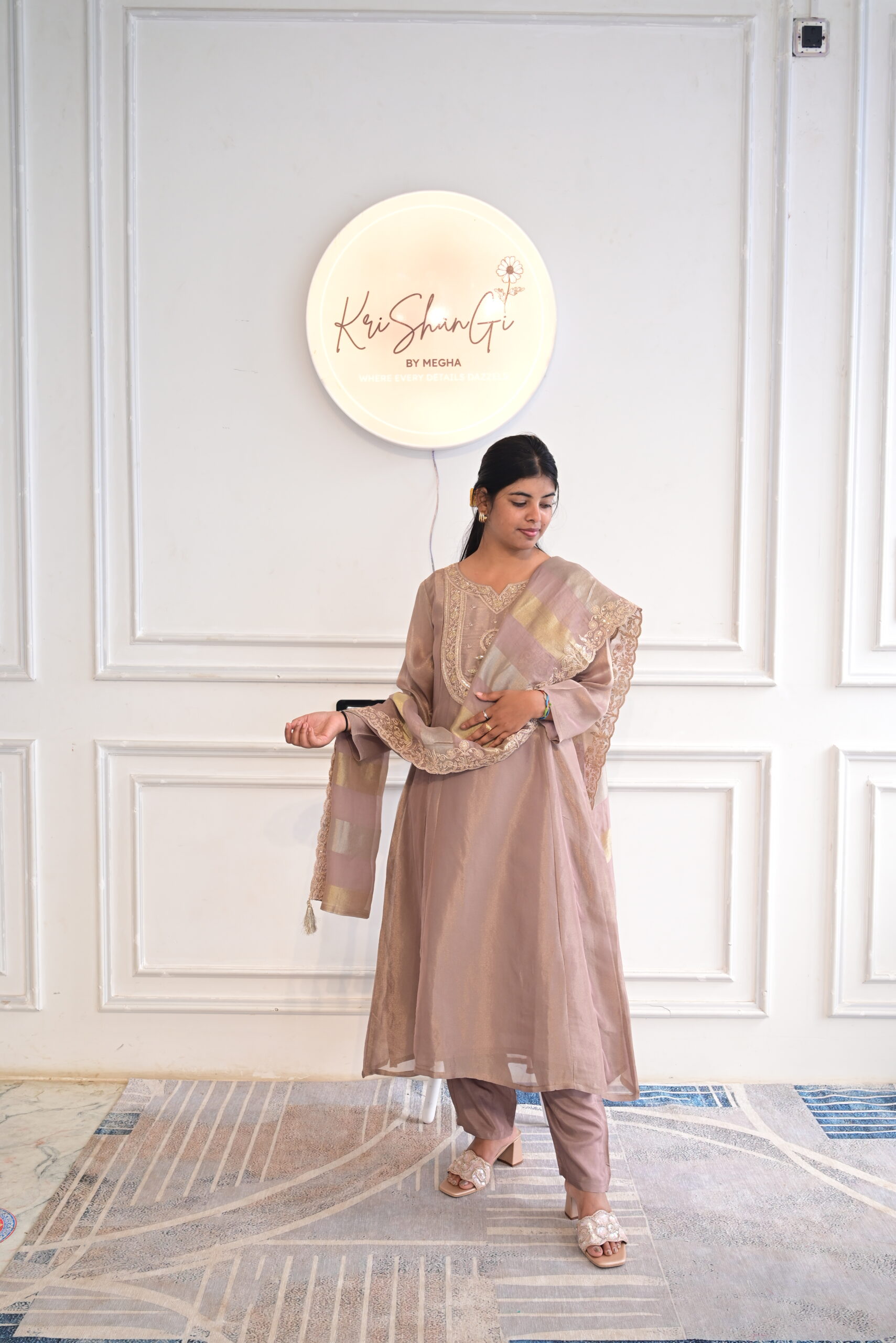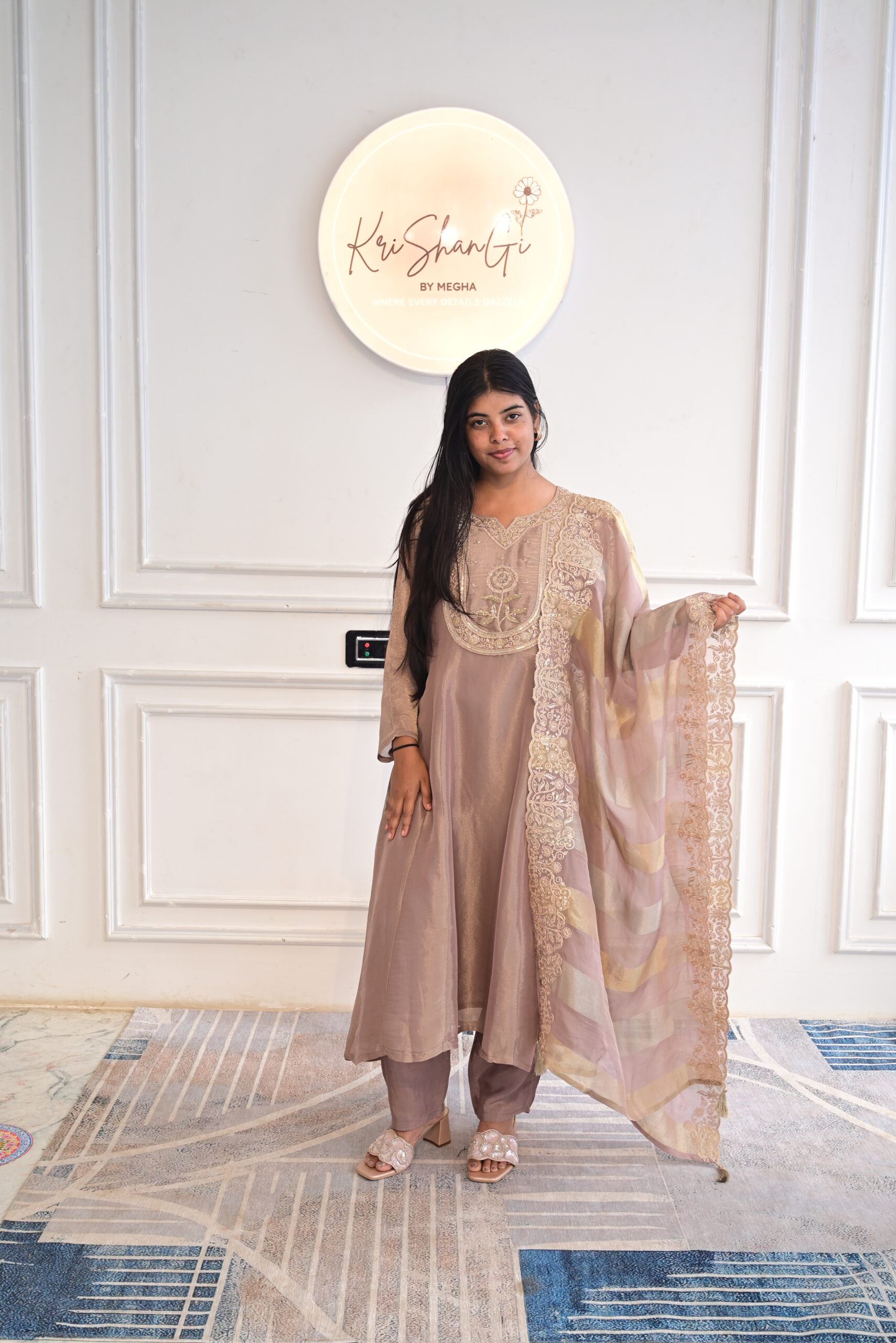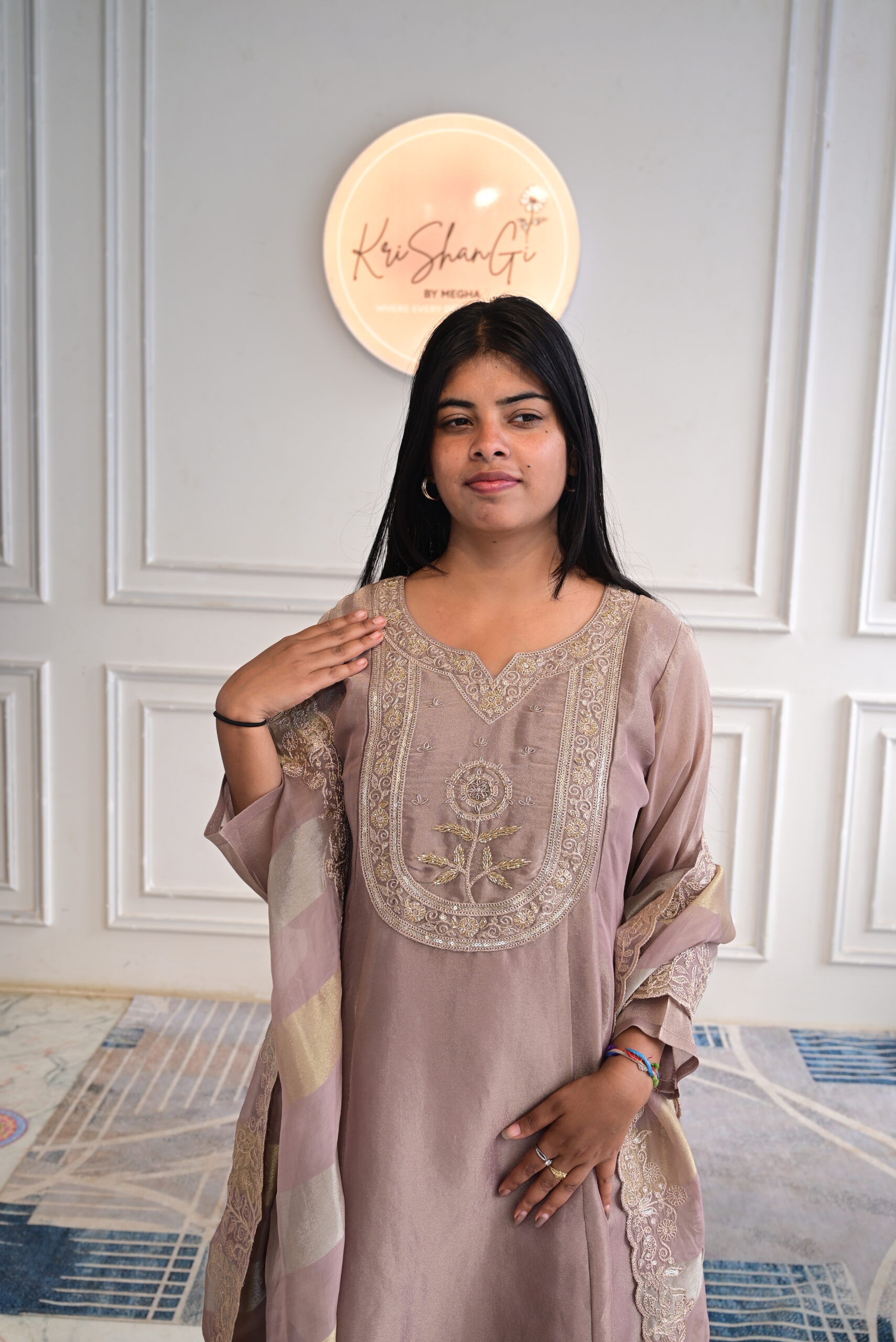 Step into refined elegance with this beautifully crafted Pure Glass Tissue Suit Set in Taupe, designed with rich hand detailing and graceful shimmer.