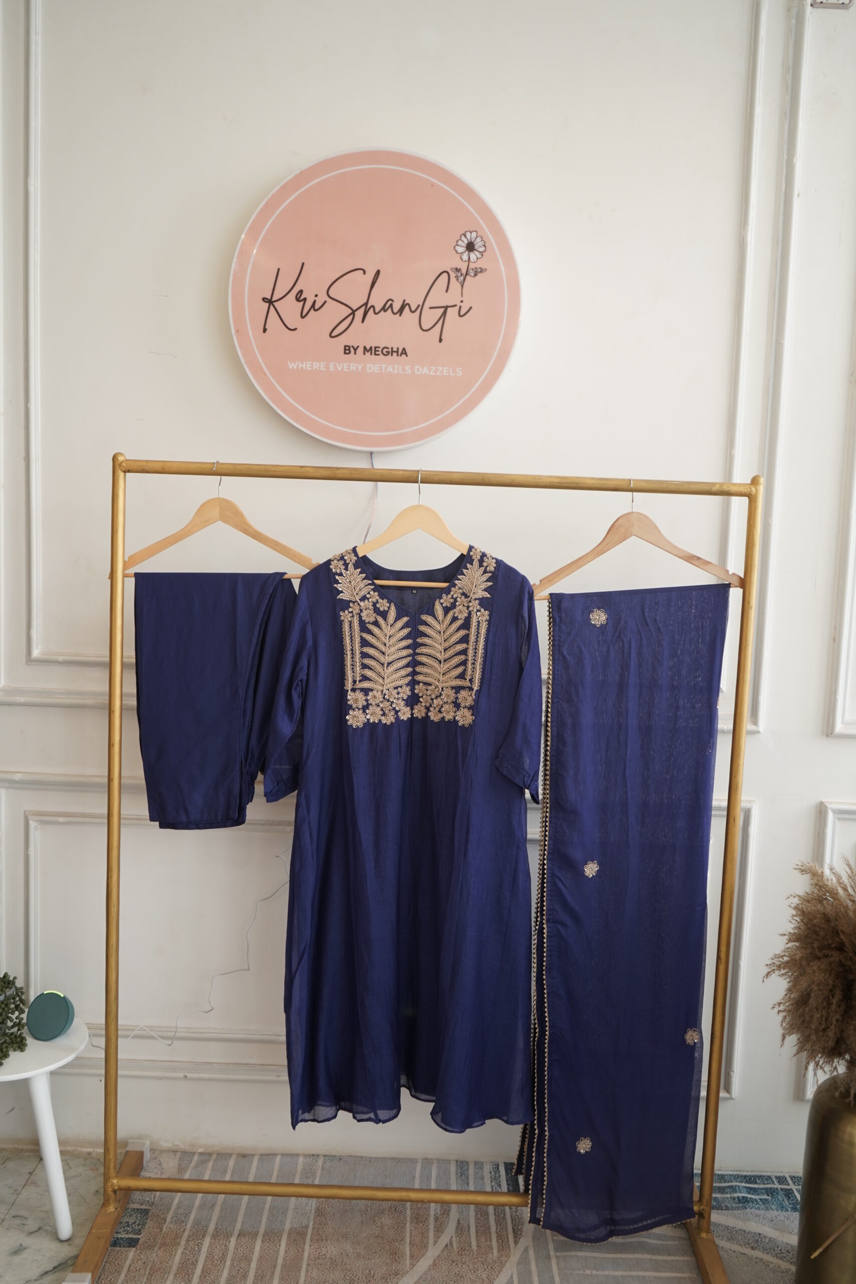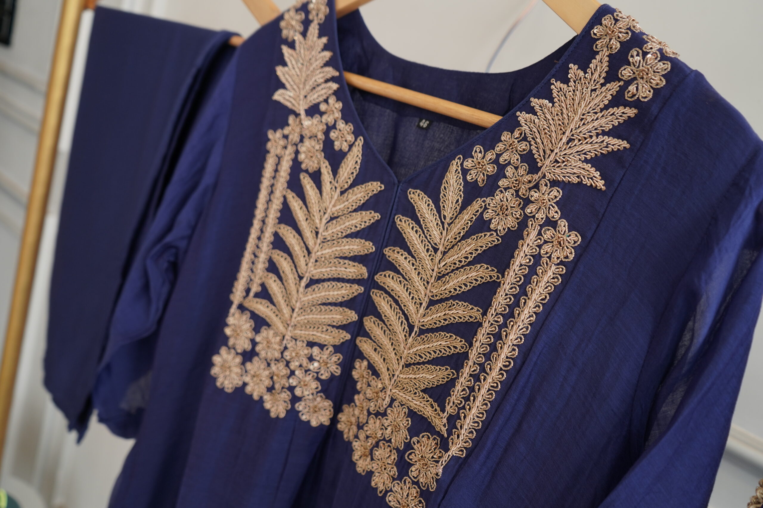 The kurta features exquisite zari thread handwork on the neckline, beautifully complemented by delicate small bootis scattered on the neck, creating a subtle yet luxurious design. The 3-piece set includes the kurta, bottom, and dupatta, each meticulously crafted to ensure a perfect fit and effortless drape. The combination of fine fabric and artisanal handwork makes this suit set a timeless addition to your ethnic collection.