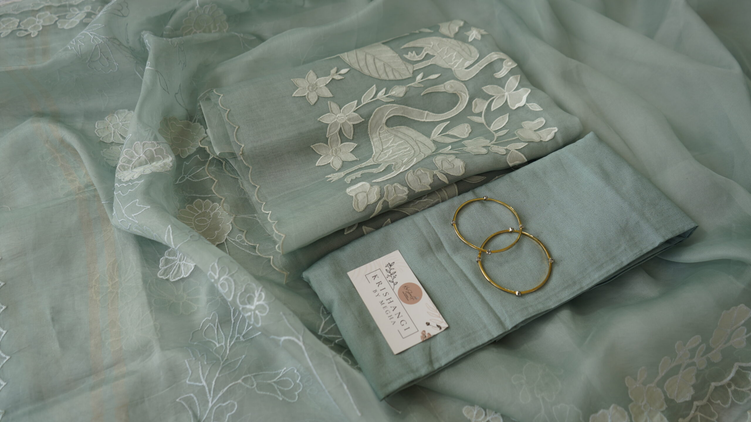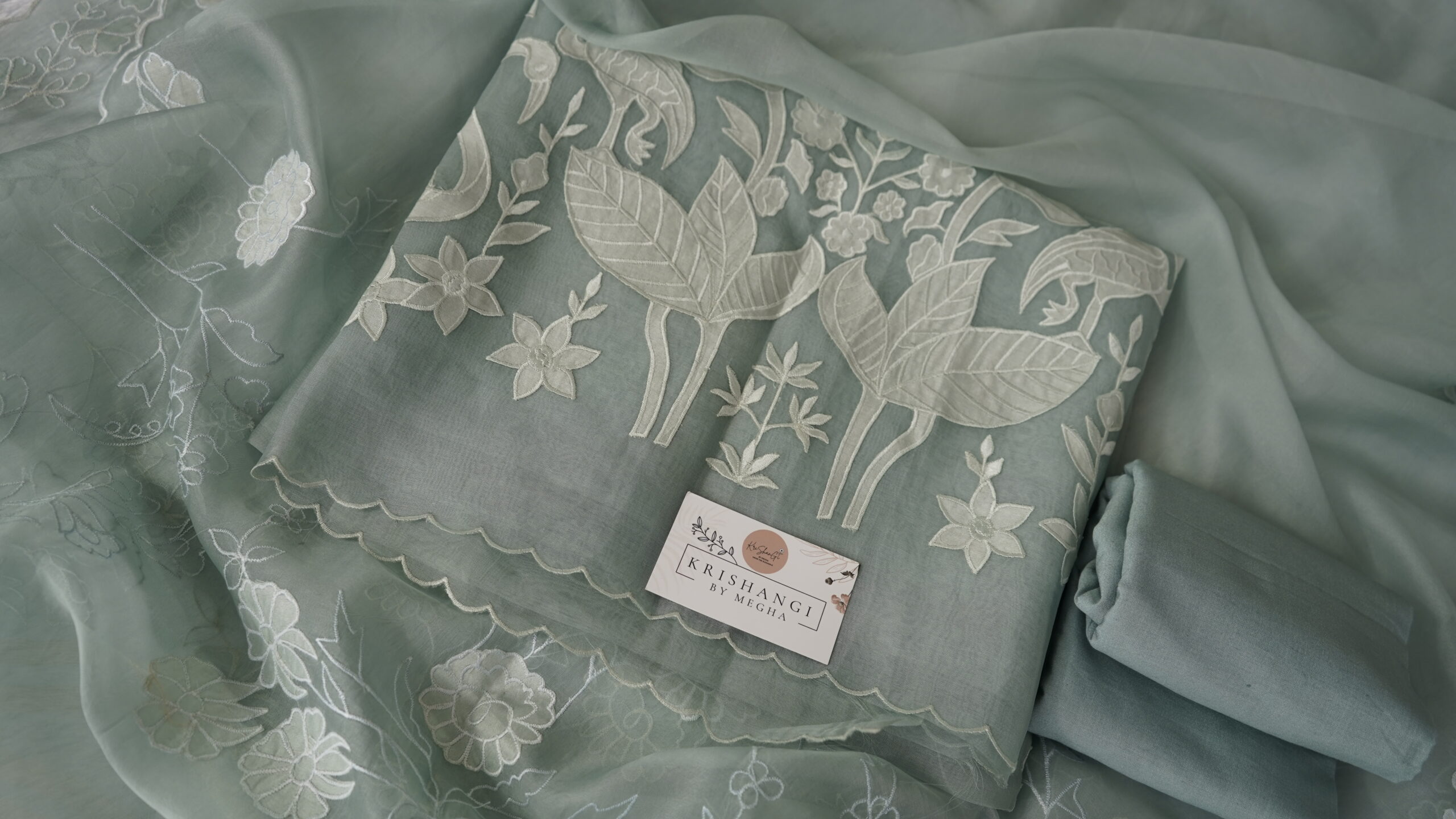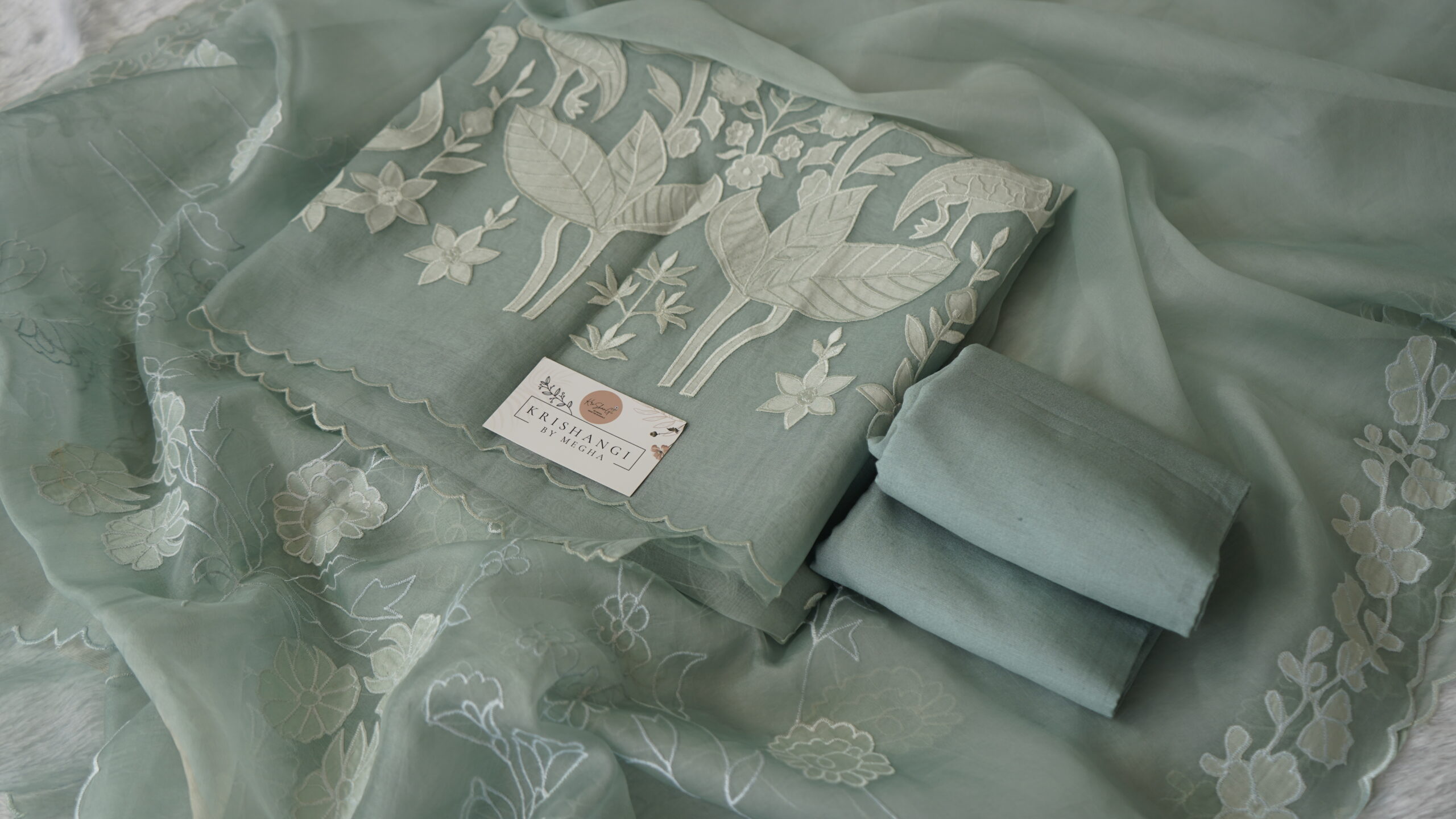 Add an ethereal charm to your ethnic collection with Krishangi’s Pure Organza Applique Work Suit Set. This premium 3-piece outfit includes: