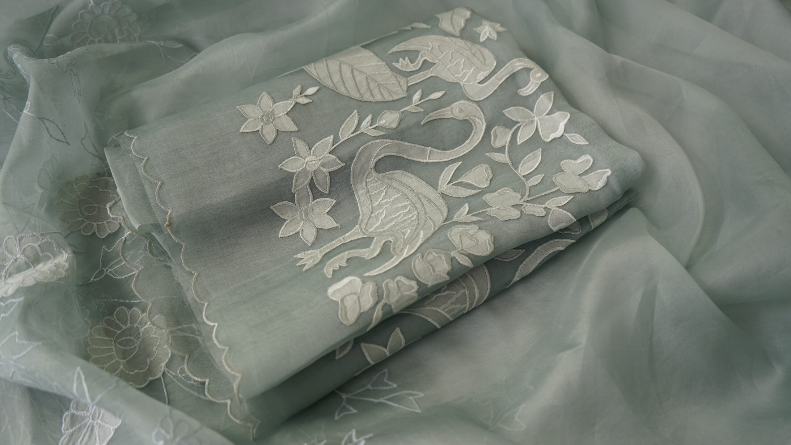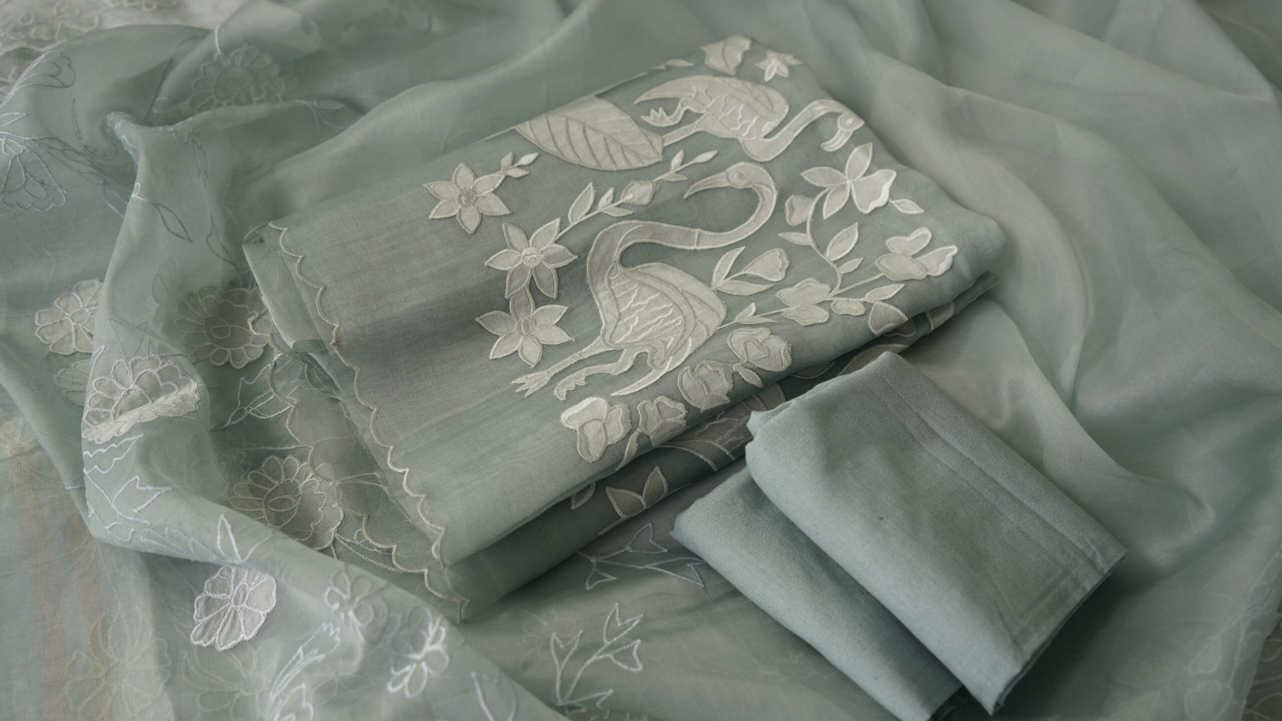 Pure Organza Applique Work 3-Piece Suit Set | Organza Kurta, Cotton Silk Pants & Applique Dupatta