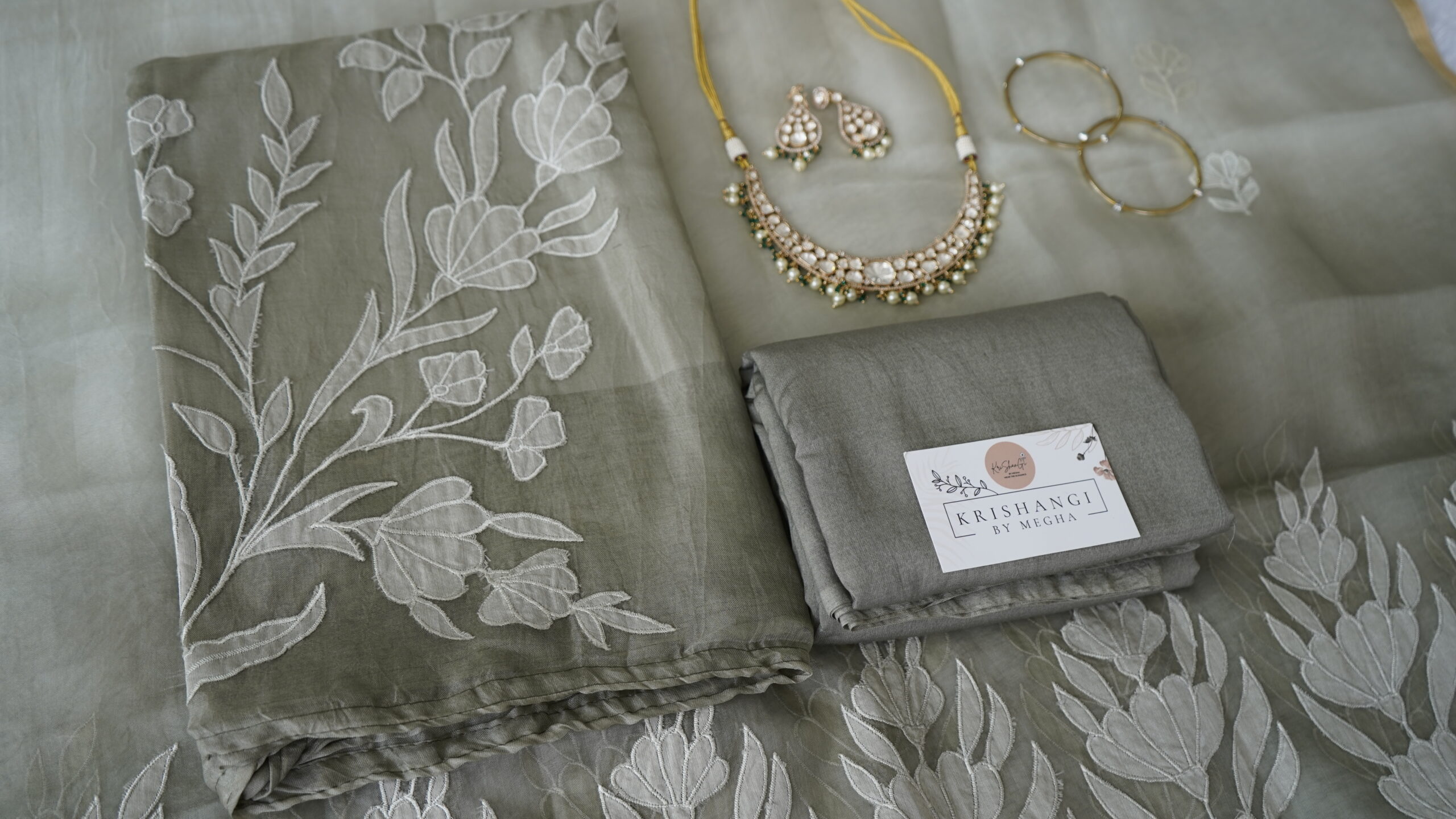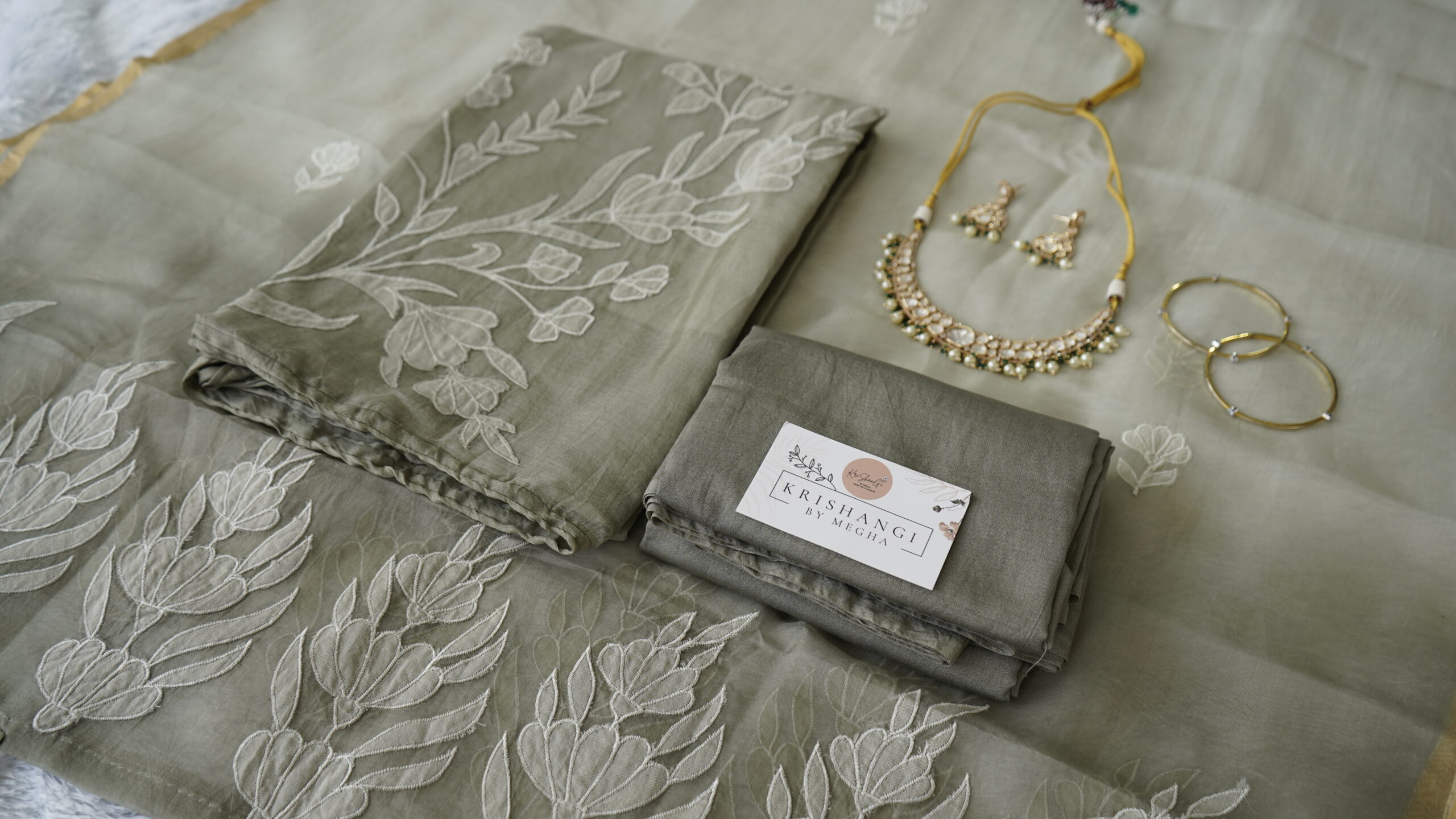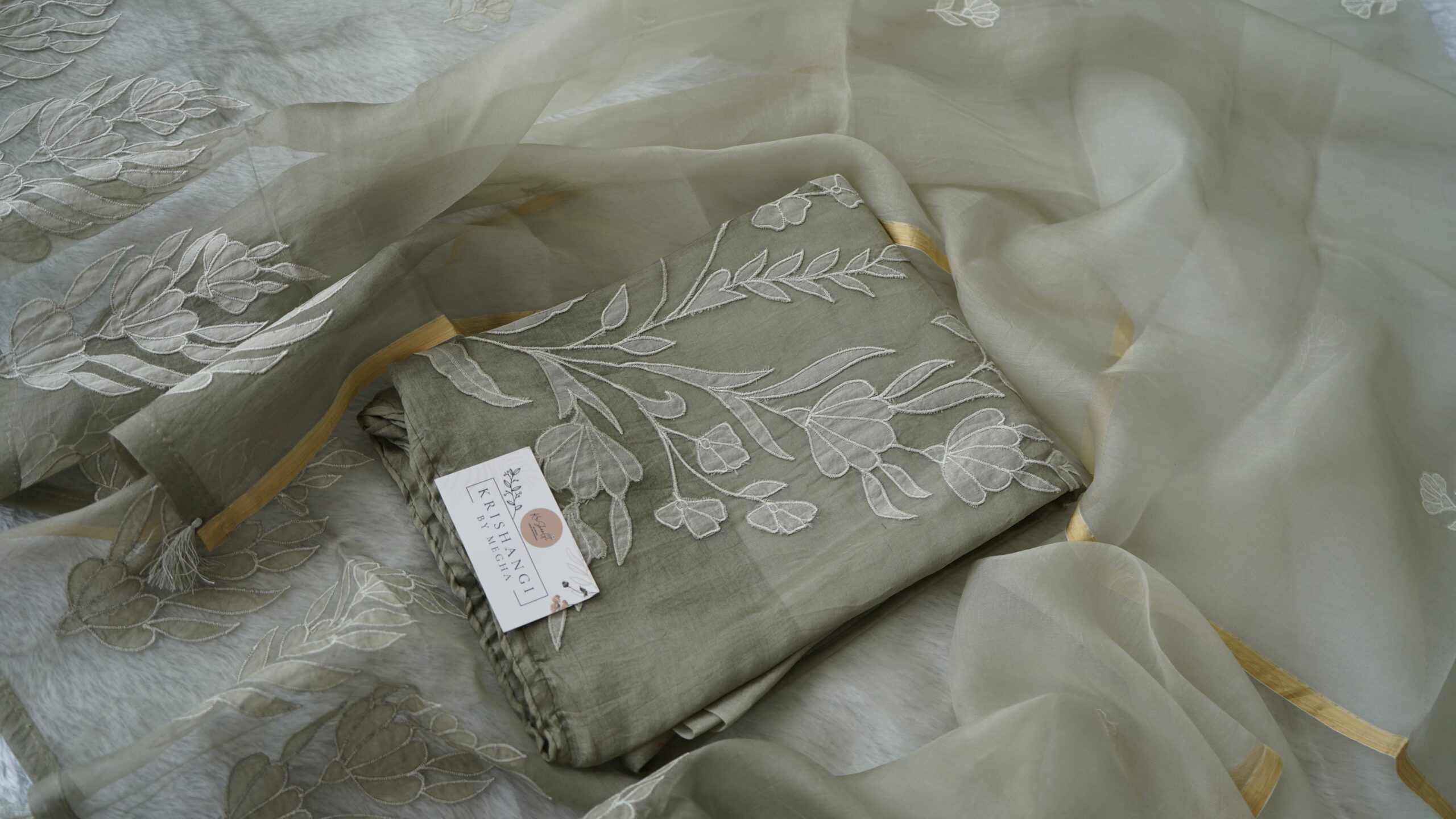 1. Unstitched Pure Organza Salwar Suit Material – Applique Work.